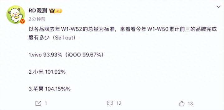 根据RD观测的最新数据,在衡量最终市场的激励活量口径下,截至2025年第50周,中国市场主要品牌的表现亮眼。其中,小米以101.92%的全年完成度领先,而苹果更是达到了104.15%。vivo(含iQOO)以93.93%的完成度紧随其后。